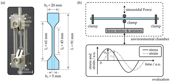 (a) Setup and specimen geometry for the determination of the tensile properties of injection-molded COC. (b) Working principle of the dynamic mechanical thermal analysis setup employed to examine the temperature-dependent flexural properties of the COC samples.