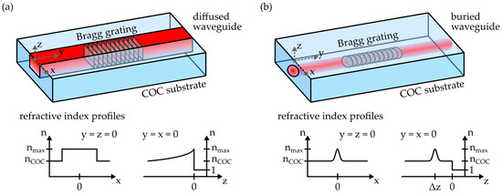 Schematics and refractive index profiles of (a) diffused waveguides, fabricated via the single-writing-step method, and (b) buried waveguides, manufactured via femtosecond laser-based direct writing. Both waveguide types can comprise Bragg grating structures.