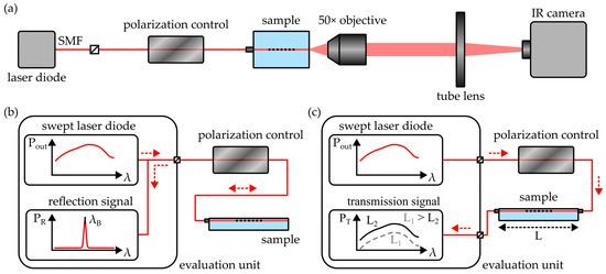 Schematics of the employed experimental setups for (a) near-field analysis, (b) quantification of the Bragg reflection signal and (c) determination of the waveguide attenuation by means of the cut-back method. All setups feature a polarization control unit for the distinct excitation of the waveguide’s TE or TM mode. Red, dashed arrows indicate the propagation direction of the radiation.