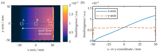 Overall, the determined results correlate well with the known formation of near-surface birefringent regions when amorphous thermoplastics are injection-molded [24]. As birefringence directly correlates with the local degree of molecular orientation [23,25], the results allow interpretation of the respective preferred polymer chain orientation direction within the injection-molded COC plates. Overall, a high degree of molecular orientation is located in the near-surface regions close to the injection gate, while a linear decrease in molecular orientation with increasing distances from the gate is determined. At the center of the COC plate, the birefringence and thus the molecular orientation is significantly reduced and constant throughout the whole specimen. The fact that the maximum optical birefringence observed in the xz-plane is significantly higher than in the yz-plane leads to the conclusion that the preferred polymer chain orientation direction is parallel to the melt flow direction in these regions.