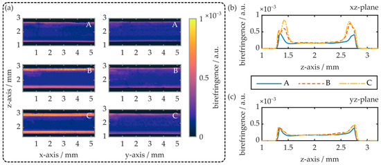 (a) Exemplary false-color representations of the birefringence in the xz- as well as the yz-plane of the injection-molded COC plates. (b,c) show the respective z-axis birefringence profiles. The samples were obtained from regions A, B and C of an injection-molded COC specimen (see Figure 6).