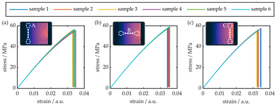 Multiple strain gauges from different regions of the birefringent COC plate were manufactured and their stress–strain behavior was examined. Overall, 18 specimens, i.e., 6 samples per position, were evaluated. The results as well as the respective sample positioning is shown in Figure 8.