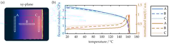The flexural properties of the COC plates as well as the glass transition temperature were determined via DMTA analysis. Therefore, appropriate samples were cut from the same regions of the plate, as outlined in Figure 9a. The respective results, i.e., flexural modulus as well as normalized tan(δ), in a temperature range from 18 °C to 180 °C, are shown in Figure 9b.