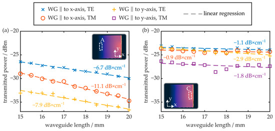 Multiple near-surface waveguides were fabricated in different regions of the injection-molded COC. Since they exhibited the most different behavior with respect to their inherent birefringence, the upcoming experiments focus on regions A (opposite to the injection gate) and C (close to the injection gate). In both regions, waveguides oriented parallel to the plate’s x- and y-axis were generated, and the polarization-dependent transmitted power, at wavelengths around 1550 nm, was determined as a function of the waveguide length via the cut-back method. The results are summarized in Figure 10.