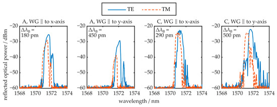 TE and TM polarization mode reflection signals of Bragg gratings from different regions (A and C, see Figure 10) and with different orientations (WG ‖ to x-axis and WG ‖ to y-axis). Furthermore, the Bragg wavelength difference ΔλB of both polarizations is stated.