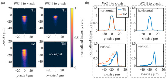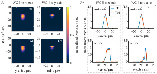 Again, like in previous experiments, the TM mode is not sufficiently supported by the waveguide oriented parallel to the y-axis. Thus, there is no evaluable near-field signal. In the horizontal plane, the modal shape is comparable in all cases, independent of the waveguide’s orientation and the polarization mode. In the vertical plane, however, the waveguide orientation and the excited polarization influence the near-field intensity distribution significantly. If the waveguide is oriented parallelly to the y-axis, the TE mode reaches about 20 µm into the substrate (e−2-value). If the waveguide is oriented parallelly to the x-axis, the TE mode penetrates 26 µm deep into the substrate, while the TM mode’s edge is located more than 55 µm underneath the substrate surface.