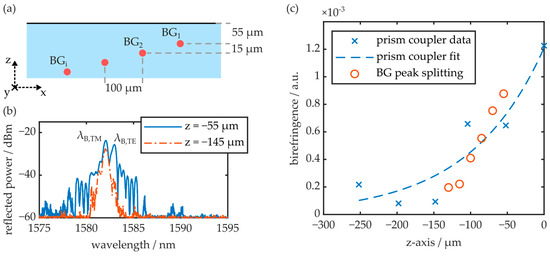 All waveguides were equipped with Bragg gratings. Figure 14b depicts the reflection signal of two photonic structures fabricated at depths of 55 µm and 145 µm, respectively. The waveguides are excited with unpolarized light. Thus, the reflection spectrum comprises the superimposed signal of the TE and the TM reflection peaks. While the BG close to the surface exhibits significant peak splitting, the BG buried deeper in the substrate comprises a single reflection peak, as it is located in the less birefringent volume of the substrate. The birefringence, calculated according to Equation (10) from the determined peak splitting, is visualized as a function of the BG’s z-axis position in Figure 14c. The graph furthermore comprises the substrate’s birefringence depth profile acquired via the prism coupler. Therefore, the substrate thickness is reduced layer by layer with the micro mill and then polished back to optical quality in between measurements. The birefringence depth profile agrees well with the birefringence data acquired via polarimetry (see Figure 7).