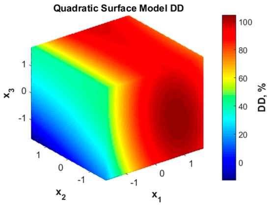 The response surface corresponding to this model (Equation (6)) is given in Figure 2.