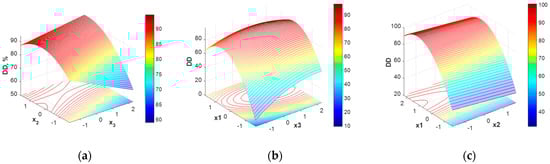 Chitosan deacetylation degree (DD) variation with operating condition expressed in coded values: (a) x1 = 0, (b) x2 = 0, (c) x3 = 0.