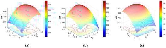 Chitosan molar mass (MM) variation with operating condition expressed in coded values: (a) x1 = 0, (b) x2 = 0, (c) x3 = 0.