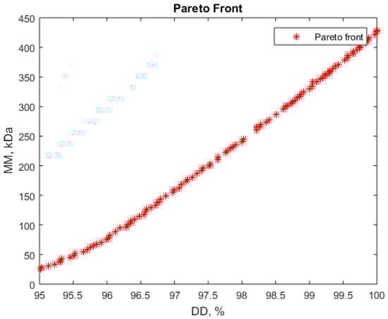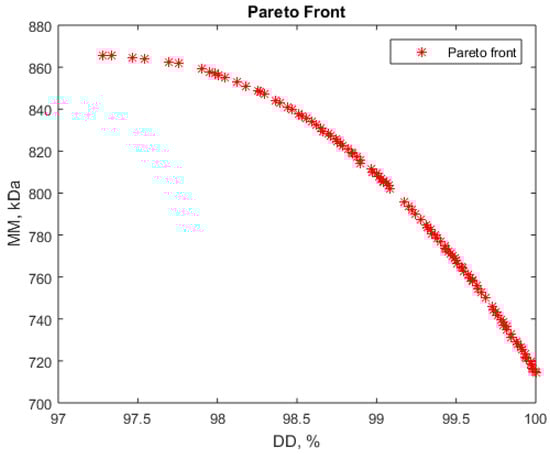 Pareto front for simultaneous maximization of deacetylation degree (DD) and minimization of molar mass (MM).