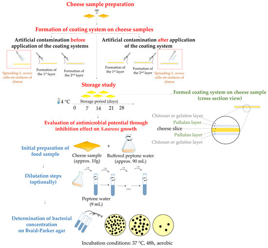 Illustration of coating systems formation on cheese samples and antimicrobial assessment.
