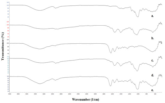 FTIR spectra of (a) Pull film, (b) CS film, (c) Gel film, (d) Pull/CS bilayer film with incorporated hydrolats, and (e) Pull/Gel bilayer film with incorporated hydrolats.
