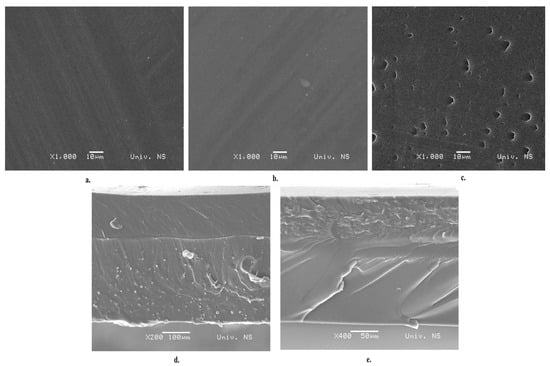 SEM micrographs of the monolayer film surface and bilayer film cross-sections are shown in Figure 4. Cross-sections of the bilayer films (Figure 4d,e) reveal the existence of good adhesion between Pull and CS, as well as between the Pull and Gel layers. Good adhesion is the result of hydrogen bonding, and it is desirable as it is the starting point for achieving better barrier and mechanical properties.