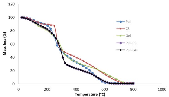 TGA thermograms of monolayer (Pull; CS) and bilayer films (Pull/CS; Pull/Gel).