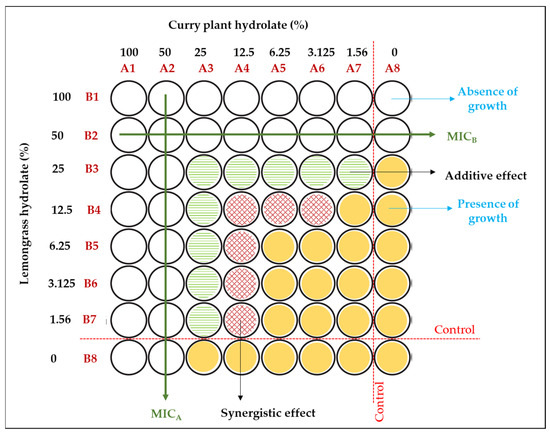 The observed differences in antimicrobial efficacy raise the possibility of a potential synergistic effect between the two hydrolats. Therefore, it was essential to consider that the results presented are based on inhibition zone assays that have to be fulfilled with an investigation on the potential synergistic effect of these two hydrolats. To explore this further, a checkerboard assay was conducted as part of this study through a checkerboard test (Figure 6).