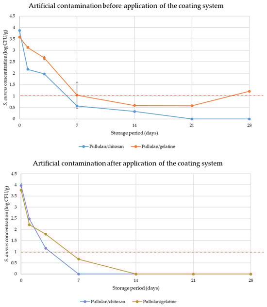 Since the antimicrobial potential of active Pull/CS and Pull/Gel coating layers was demonstrated (Table 4 and Figure 6), a coating procedure was applied for cheese samples (Figure 2). The results of the testing of coating efficiency are presented in Figure 7. Observing bacterial behavior in coating systems for both cases of artificial contamination (before and after application of coatings, respectively), a decreasing trend in bacterial concentration during the 28 days of the storage period in both cases was evident. Moreover, the impact of antimicrobial active coatings against S. aureus cells (before and after the application of coating systems) was proven.