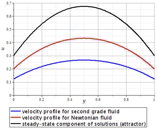 Using Formulas (29)–(33), it is easy to calculate and visualize the x-component of the velocity for the unsteady Poiseuille flow of both second grade fluids and Newtonian fluids; see, for example, Figure 2.