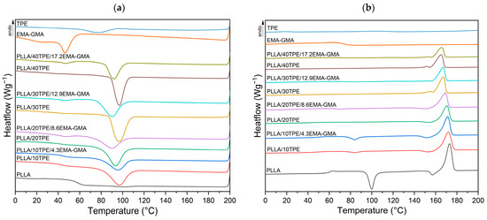 In order to draw clear conclusions about the mechanism involved in the improved toughness, it is essential to investigate the thermal properties and crystallinity of the blends. Of particular importance is the crystallization behavior of the main PLLA phase. The detailed results of the DSC analysis and the calculated values of the degrees of crystallinity are summarized in Table 2. Figure 1a represents the cooling phase where the crystallization curves of the individual blend components (PLLA, TPE, and EMA-GMA) and uncompatibilized (PLLA/TPE) and compatibilized (PLLA/TPE/EMA-GMA) blends are shown. Melt crystallization curves were recorded at a cooling rate of 10 °C∙min−1 and followed the first heating step where the thermal processing history was removed. Figure 1b shows the melt behavior after the cooling phase. A heating rate of 10 °C∙min−1 was used.