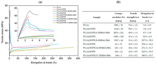 Figure 2a,b present the results of tensile tests on PLLA, uncompatibilized (PLLA/TPE), and compatibilized (PLLA/TPE/EMA-GMA) blends at various concentrations. Figure 2a shows typical tensile stress–strain curves with a detailed inset for courses at small strain ranges. Figure 2b depicts the average values of the tensile modulus, tensile strength, and elongation at break with standard deviations.