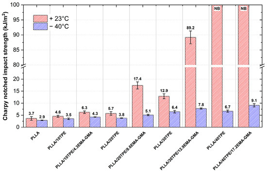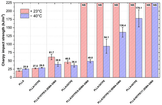 As shown in Figure 3, neat PLLA exhibited typical low impact strength. It is worth noting that the impact strength was lower at ambient temperatures than in sub-zero conditions. Meekum and Khiansanoi [103] previously observed this behavior, while Mysiukiewicz et al. [104] attributed it to the intensification of the intermolecular polymer chain interactions in sub-zero conditions. The introduction of 10 wt. % of TPE resulted in only a minor improvement in impact strength, with comparable results in both conditions. However, when a compatibilizer (PLLA/10TPE/4.3EMA-GMA) was added, the impact strength was enhanced by 70% and 55% at an ambient temperature compared to neat PLLA and PLLA/10TPE, respectively. Such behavior clearly indicates synergistic improvement in rubber toughening due to enhanced interfacial adhesion at interfaces with the introduction of the EMA-GMA compatibilizer. During impact testing of PLLA/10TPE/4.3EMA-GMA samples, a decrease from 61.7 kJ∙m−2 at an ambient temperature to 39.9 kJ∙m−2 in sub-zero conditions was observed. Uncompatibilized PLLA/20TPE samples yielded medium impact strength, which predictably increased compared to PLLA/10TPE. However, when compared to compatibilized PLLA/10TPE/4.3EMA-GMA samples, the values declined. Moreover, when a blend containing 20 wt. % TPE was enhanced by 8.6 wt. % EMA-GMA, we were unable to break the resulting samples under ambient conditions. The specimens that do not break during impact testing are marked as ”NB” (Not Break) in both Figure 3 and Figure 4. As previously discussed in the tensile testing chapter, toughened ternary PLLA/20TPE/8.6EMA-GMA samples reached the brittle–ductile transition at this concentration. The typical low crack initiation energy of an amorphous and brittle PLLA matrix has been sufficiently suppressed.