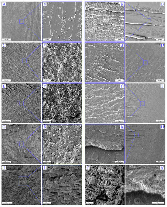 SEM images of impact cryo-fractured (−40 °C) notched samples of uncompatibilized and compatibilized blends: PLLA (A,a); PLLA/10TPE (B,b); PLLA/10TPE/4.3EMA-GMA (C,c); PLLA/20TPE (D,d); PLLA/20TPE/8.6EMA-GMA (E,e); PLLA/30TPE (F,f); PLLA/30TPE/12.9EMA-GMA (G,g); PLLA/40TPE (H,h,h′); PLLA/40TPE/17.2EMA-GMA (I,i,i′).