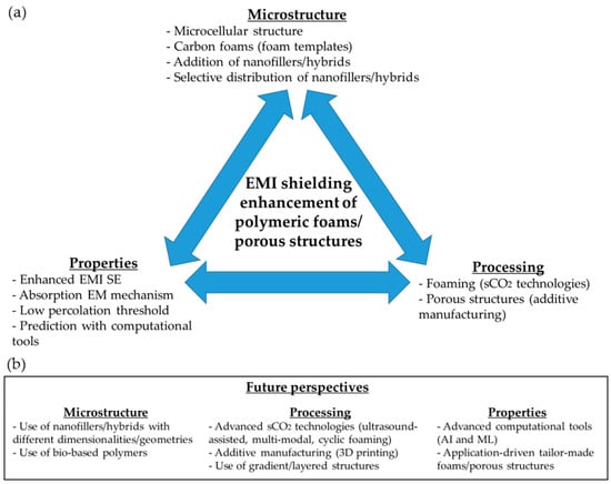 (a) Recent strategies used to enhance the EMI shielding properties of polymeric foams/porous strutures and (b) future perspectives.