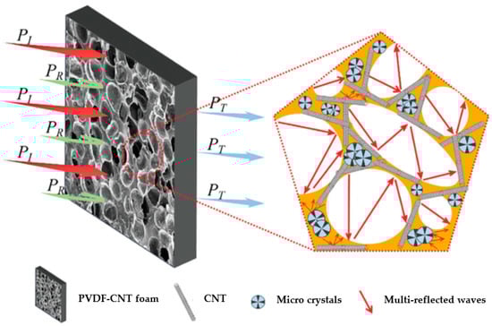 Scheme of EM wave dissipation in PVDF-CNT foams []. Copyright 2023, John Wiley & Sons. Note: PI—incident wave power; PR—reflected wave power; PT—transmitted wave power.