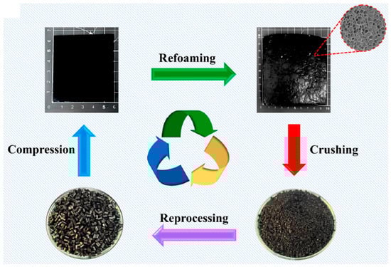 Recycling, reprocessing and refoaming of TPAE-SWCNT nanocomposite foams []. Copyright 2023, Elsevier.
