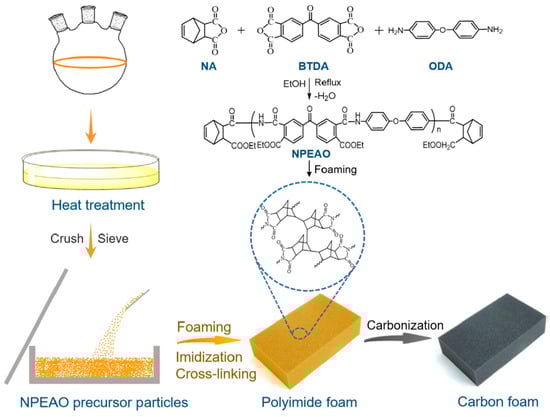 Scheme showing the fabrication of carbon foams using thermosetting PI foam []. Copyright 2023, Elsevier.