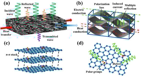 (a) Electromagnetic shielding and heat transfer diagram of c-MG/PA; (b) electromagnetic shielding and heat transfer mechanism of the dual cross-linking network of c-MG; (c) interface polarization loss mechanism of the GnP network; (d) dipole polarization loss mechanism of rGO network []. Copyright 2023, Elsevier.