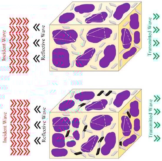 As several researchers have demonstrated the importance of developing foams with a controlled microcellular structure for promoting absorption-dominant EMI shielding, sCO2 foaming has been well regarded as a foaming strategy for the fabrication of lightweight materials intended for highly demanding EMI shielding protection applications [,,]. Indeed, Dun and co-workers [] prepared solid state sCO2 foaming polyvinylidene difluoride-carbon nanotubes (PVDF-CNT) using nanocomposite foams for EMI shielding purposes. They demonstrated that the generation of a cellular structure during foaming gradually favored the interconnection between carbon nanotubes, thus promoting the formation of an effective, conductive CNT network through the cell walls of the foams. As a consequence, the final materials comprised high electrical conductivities and EMI shielding efficiencies (reaching a specific value of almost 30 dB·cm3/g). Additionally, as the generation of the cellular structure during sCO2 foaming led to the reorientation of CNTs, the resultant foams displayed considerably lower percolation thresholds for electrical conduction when compared with their un-foamed nanocomposite counterparts (0.40 vol% CNT compared with 1.44 vol% CNT, i.e., almost four times lower). The authors also demonstrated how the EMI shielding mechanism gradually changed from being reflection-dominant in the case of the un-foamed nanocomposites, to absorption-dominant with foaming; the controlled cellular structure also contributed to an effective mechanism whereby multiple reflections occurred (see scheme presented in Figure 2).