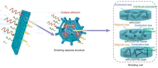 Scheme of the EMI shielding mechanism for PU-CNT and PU-CNT-Ni composites []. Copyright 2023, Springer Nature.