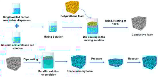 Scheme of the fabrication process for conductive and shaped memory PU foams for EMI shielding []. Copyright 2023, Elsevier.