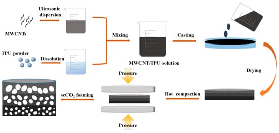 Scheme showing the preparation of TPU-MWCNTs foam with a multilayer gradient structure []. Copyright 2023, Elsevier.