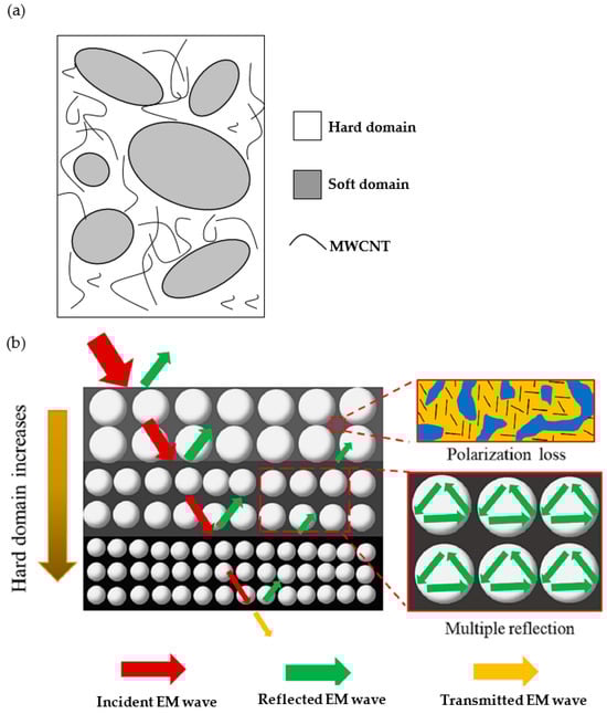 (a) Scheme showing the phase separation of TPU-MWCNTs systems (adapted from []) and (b) representation of the EMI shielding mechanism of TPU-MWCNTs foam with a multilayer gradient structure []. Copyright 2023, Elsevier.