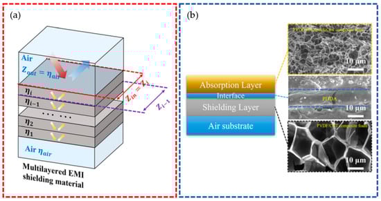 (a) Representation of the input impedance of the multilayered EMI shielding material with i layers, and (b) scheme showing the layered composite foam structure formed by PVDF-30 wt% SiCnw@MXene10:1 composite foam as the absorption layer, and PVDF-8 wt% CNT composite foam as the shielding layer []. Copyright 2023, Royal Society of Chemistry.