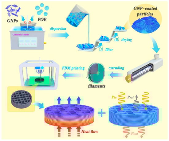 Scheme showing the preparation of POE-GnPs filaments and the FDM 3D printing process []. With permission from American Chemical Society.