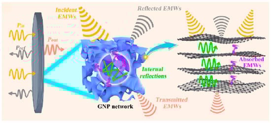 Scheme showing the absorption/multiple reflection EMI shielding mechanism of POE-GnP foams []. With permission from American Chemical Society.