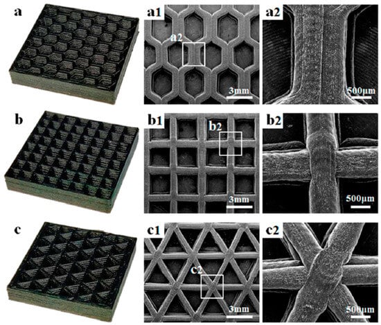 Digital images and SEM micrographs of FDM 3D-printed cellular honeycomb-like structures with different cell geometries: hexagon (a,a1,a2), square (b,b1,b2), and triangle (c,c1,c2) []. With permission from American Chemical Society.