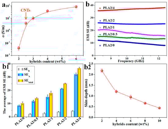 (a) Electrical conductivity and (b) EMI SE of PLA-GnPs-CNTs cellular nanocomposites; (b1) EMI shielding parameters including SEtotal, SER, and SEA and (b2) skin depth []. With permission from American Chemical Society.