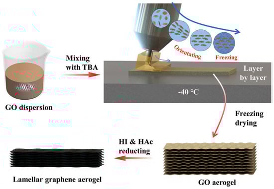 Scheme of the 3D printing LGA process, from the preparation of the GO dispersion to the final lamellar graphene aerogel []. Copyright 2023, John Wiley & Sons.