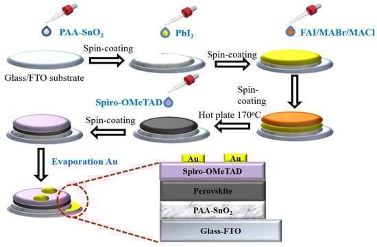 The preparation of PSC is shown in detail in Figure 1. The glass/FTO substrate was cleaned using distilled water, acetone, and isopropanol. Then, the FTO glasses were dried using a nitrogen gun and treated with UV–ozone for 20 min. The SnO2 precursor was obtained by dissolving SnO2 (450 μL) colloid dispersion and LiCl (300 μL) aqueous solution (17 mg/4 mL) in water (2 mL) []. For PAA@SnO2, PAA (0.5, 1.0, 2.0, and 3.0 mg/mL) was added into the SnO2 precursor solution. The SnO2-based electron transport layer was spin-coated on the cleaned FTO at 3000 rpm for 30 s. This was followed by annealing at 150 °C for 30 min in air. Then, the substrates were treated with UV–ozone for 20 min before being transferred into a glovebox. The perovskite films were fabricated using a typical two-step sequential deposition method. First, 50 μL of PbI2 precursor solution (600 mg PbI2 dissolved in (DMF 0.9 mL) and (DMSO 0.1 mL)) was spin-coated onto SnO2 films at 2000 rpm for 20 s. The FAI/MABr/MACl mixed solution (60 mg FAI, 6 mg MABr, and 6 mg MACl dissolved in 1 mL IPA) was spin-coated onto the PbI2 film at 4000 rpm for 20 s. Then, the films were annealed at 150 °C for 20 min. After cooling to room temperature, the hole-transport layer was subsequently deposited on top of the perovskite film via spin-coating at 4000 rpm for 40 s using a chlorobenzene solution, which contained Spiro-OMeTAD (72.3 mg mL−1), tert-butylpyridine (29 μL mL−1), and bis(trifluoromethane)sulfonimide lithium salt (18.5 μL mL−1, 520 mg mL−1 in acetonitrile). Finally, 100 nm of gold electrodes were deposited on top of the devices via evaporation at approximately 10−6 Torr.