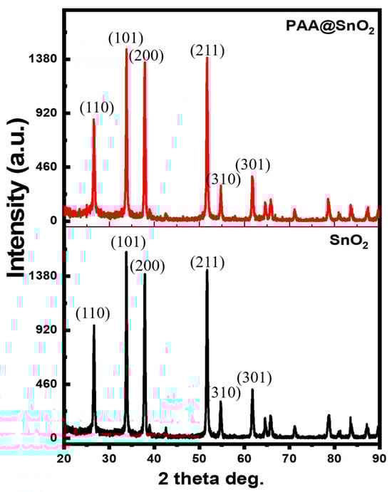 XRD analysis was performed to obtain crystallographic information regarding as-synthesised pure SnO2 and PAA@SnO2. Figure 3 displays the acquired XRD patterns for PAA@SnO2 and pristine SnO2. The main diffraction peaks at approximately 26.25°, 33.66°, 38.16°, 51.50°, 54.82°, and 61.55° for pure SnO2 correspond to (110), (101), (200), (211), (310), and (301), respectively. This indicates that a pure rutile tetragonal SnO2 structure has formed (JCPDS no. 41–1445). When a low concentration of PAA was added as a dopant, no additional peak was observed in the PAA@SnO2, indicating that PAA doping did not introduce a secondary phase as an impurity with the pure SnO2. Conversely, a reduction in peak intensity was observed in PAA@SnO2 spectrum, likely resulting from the interaction between the PAA polymer and SnO2 crystals.