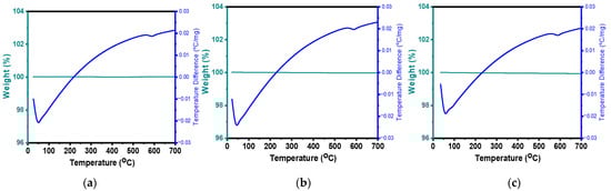 Thermogravimetric analysis (TGA) and differential scanning calorimetry (DSC) were used to determine the thermal properties of FTO, FTO/SnO2, and FTO/PAA@SnO2 from 25 °C to 700 °C in nitrogen gas flowing at a rate of 10°/min. Figure 4a shows that the FTO substrate remains stable in N2 up to 700 °C. This indicates good thermal stability without pyrolysis or thermo-oxidative decay occurring. However, conducting investigations at temperatures above 700 °C is not advisable, as this can lead to a decrease in Hall mobility and reduction in the number of oxygen vacancies. These changes result in lower mobility and fewer carriers in the FTO membrane, ultimately leading to the increased resistivity of the FTO substrate []. Additionally, the spin-coating of SnO2 and PAA@SnO2 forms thin films of 69 and 35 nm, respectively. Thus, the mass loss is not too significant, specifically 99.98% (Figure 4b) and 99.94% (Figure 4c). Furthermore, the obtained curve of the DSC analysis is very similar. In Figure 4a–c, the DSC plot shows two endothermic peaks. The first endothermic peak is approximately in the range of 45–110 °C, corresponding to the removal of the absorbed water from the substrate [,]. The other small peak at 580 °C was due to further crystallinity of the FTO substrate [,]. Therefore, the degree of SnO2 and PAA@SnO2 crystallization on the FTO substrate is appropriate for the annealing temperature of 150 °C.