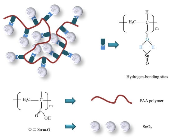 Fourier transform infrared (FT-IR) spectroscopy was analyzed to determine the presence of separate components in the PAA@SnO2 film before annealing (Figure 6b). The O-Sn-O stretching mode and Sn-O vibrational mode are responsible for the absorption peaks at 550, 650, 1550, and 1690 cm−1, respectively []. The COOH stretching modes in PAA are responsible for the peaks to appear at 1479, 1296, and 948 cm−1. It can be seen that PAA was absorbed into SnO2 film by noting that the spectrum of PAA@SnO2 exhibits the typical peaks of SnO2 and PAA, with the O-Sn-O peaks of SnO2 shifting to 670 cm−1. Furthermore, the presence of PAA at different concentrations in the SnO2 precursor solution was demonstrated by the FT-IR spectrum (Figure S3). More importantly, we explored whether annealing plays a role in the formation of PAA@SnO2. According to Figure S4, there is a slight change in the composition of pristine SnO2 and PAA@SnO2 at various concentrations post-annealing. Notably, the presence of hydroxyl groups on the film surface at 2850 and 2915 cm−1 indicates strong hydrogen bonding with the carboxylic group in the PAA polymer. This is attributed to the high temperature of the annealing process, which promotes the partial breakdown of the Sn=O bond, leading to the formation of Sn(OH)n on the SnO2 surface. The mechanism of this hydrogen bond formation is depicted in Figure 6c. Therefore, during the annealing process, the hydroxyl group on the SnO2 surface forms a hydrogen bond with the carboxylic group of PAA (as shown in Figure 5) [,,].