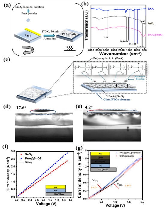 (a) Schematic illustrating the pristine and PAA@SnO2 ETL preparation. (b) FT-IR spectra of PAA, SnO2, and PAA@SnO2 films before annealing. (c) Diagram of mechanism for hydrogen bond formation. Contact angle measurement of SnO2 films without (d) or with (e) PAA polymer (blue circle: boundary region to determine the contact angle). (f) The electron mobility for the SnO2 and PAA@SnO2 films calculated by the SCLC model with the device structure of Glass/FTO/ETL/Au. (g) Dark I-V measurement of the electron-only devices based on SnO2 and PAA@SnO2 ETLs.