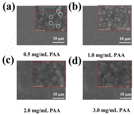 With or without PAA doping, compact SnO2 films were spin-coated onto FTO substrates using a colloid dispersion solution. To better understand the surface morphology of the coated films, atomic force microscopy (AFM) was employed. Given that FTO shows a roughness surface of 30 nm [,], both SnO2 ETL films exhibit a smooth surface, as observed in Figure S7a,b. However, a pristine SnO2 film exhibits a rougher surface than the SnO2 ETL films (26.32 nm vs. 24.98 nm), which is in line with the surface morphology observed via scanning electron microscopy (SEM), as shown in Figure 2b,c. Furthermore, it should be observed that at a concentration of 0.5 mg mL−1, several pinholes are visible, despite the fact that the agglomeration between particles is significantly reduced when compared to pristine SnO2 (as shown in Figure 7a). This result suggests that the SnO2 oligomers can be disaggregated by the hydrogen bonds of PAA and SnO2 particles. However, their affinity is insufficient to glue the particles together. When the concentration increases slightly (1.0 mg mL−1), the PAA@SnO2 surface is pinhole-free with no intergranular agglomeration through uniform particle formation (Figure 7b). Additionally, due to the high hydrogen bonding affinity between PAA and SnO2, which occurred when the mass concentration of PAA exceeded 1.0 mg mL−1 or when there were more PAA components present, PAA@SnO2 aggregated into large particles and failed to form a uniform and dense ETL layer in Figure 7c–d.