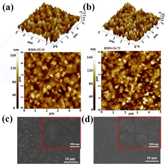 AFM images of perovskite coated on (a) SnO2 and (b) PAA@SnO2 layer. Top-view of SEM images of perovskite coated on (c) SnO2 and (d) PAA@SnO2 films.