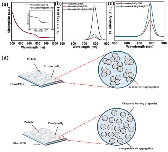 (a) UV−Vis absorption data of absorber films with SnO2 and PAA@SnO2 layers (the inset is amplifying absorption spectra in the wavelength range of 700−900 nm). (b,c) Steady-state PL spectra. (d) The diagram of film morphology for SnO2 and PAA@SnO2.
